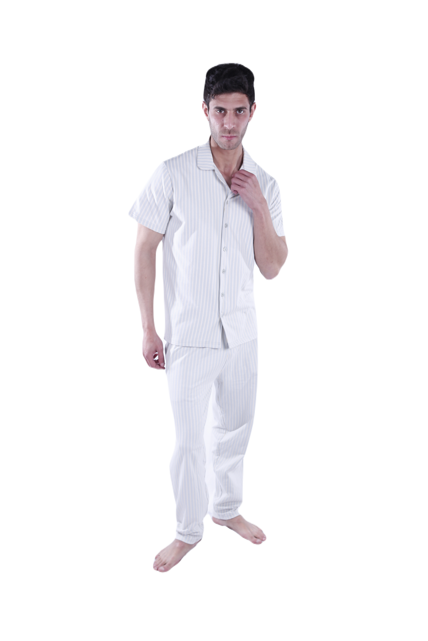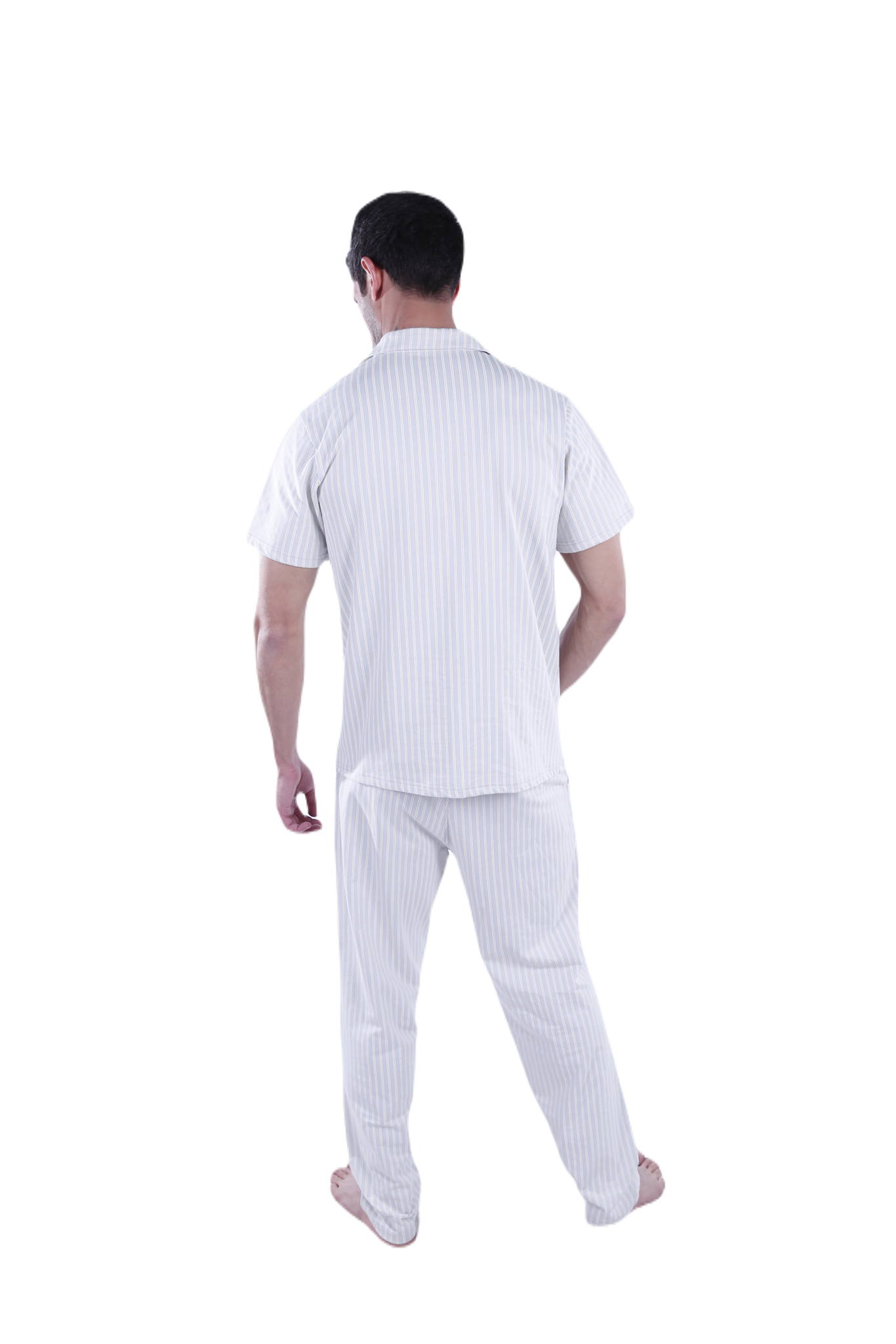 Men Short Sleeve Pajama with Buttons - Grey Yellow Stripes