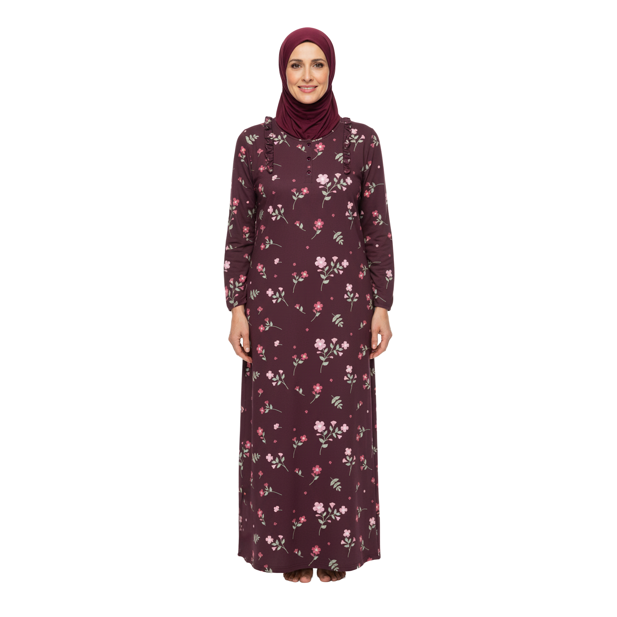 2Add warmth and elegance to your winter wardrobe with the Women LS Dress in Burgundy Flowers, crafted from ultra-soft 100% cotton interlock brushed fabric. This long-sleeve dress delivers the perfect combination of comfort and style, thanks to its breathable, warm texture and feminine floral Burgundy design. Ideal for winter lounging, cozy homewear, or relaxed casual outings.