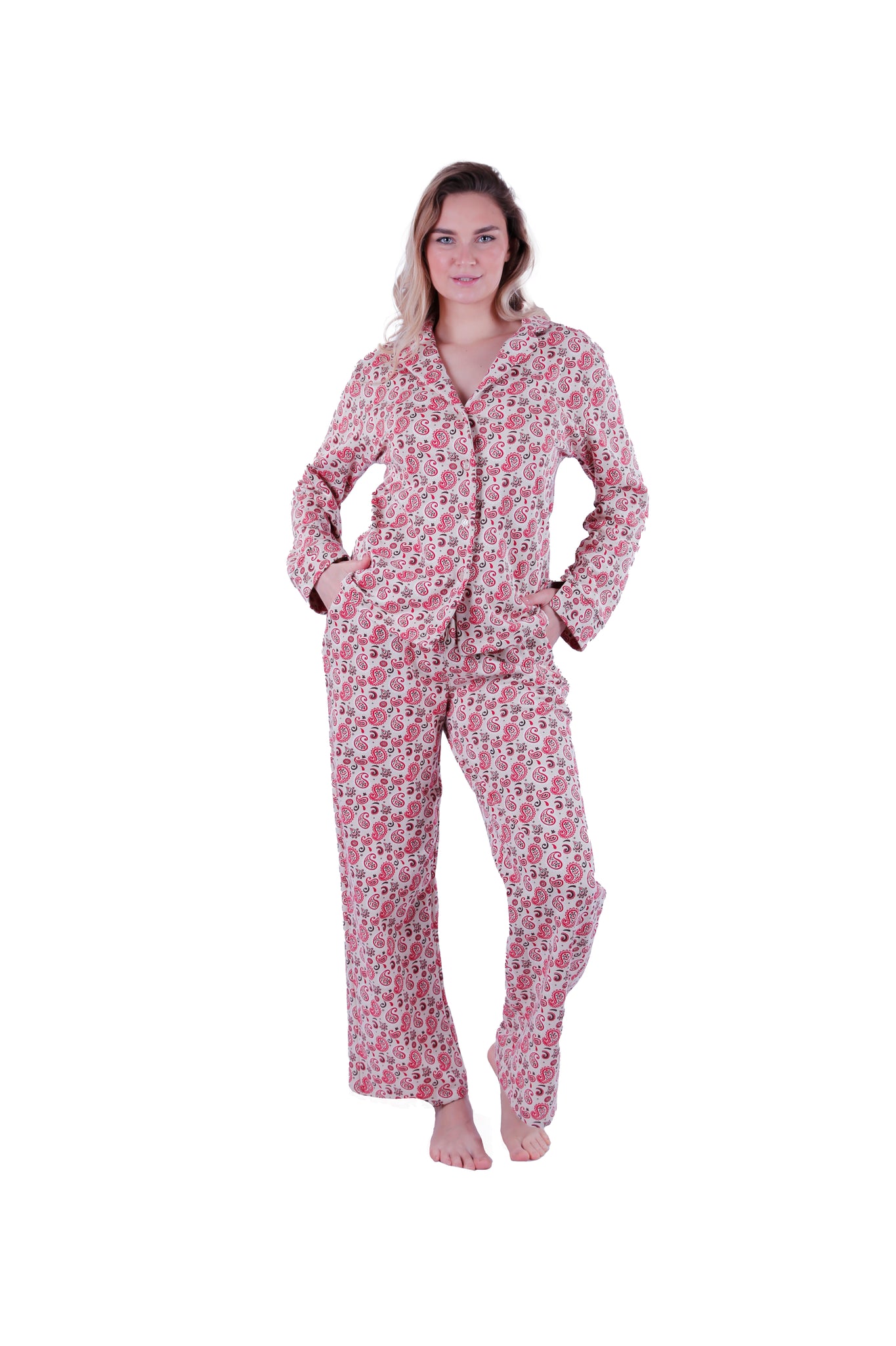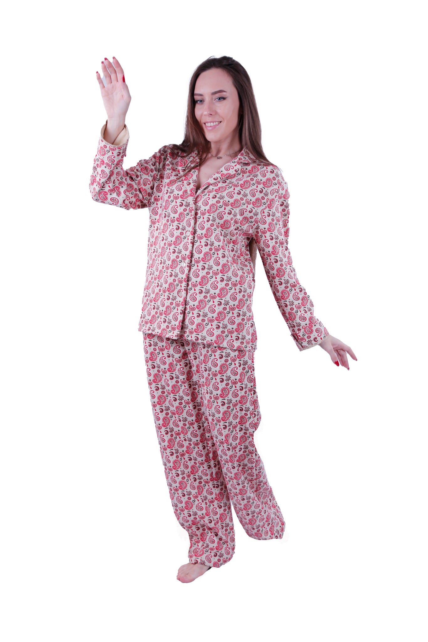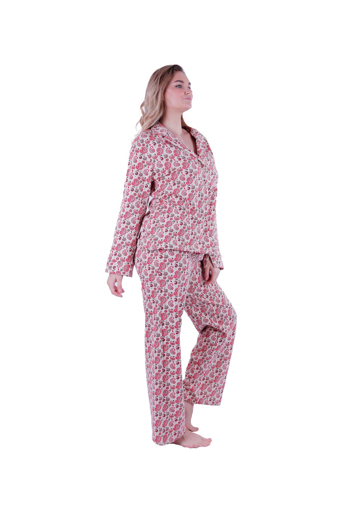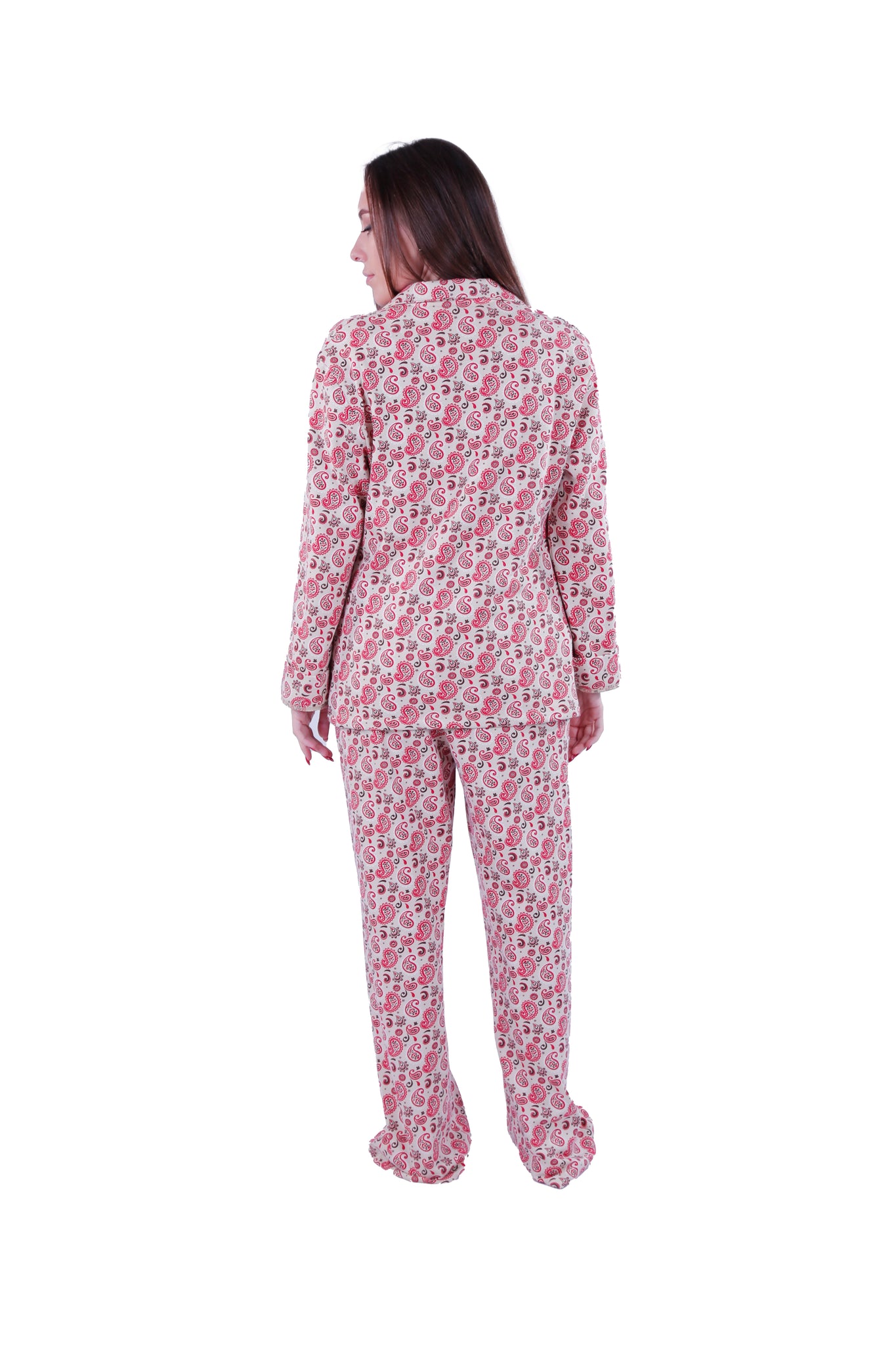 Women LS PAJAMAS WITH BUTTONS ,Red Paisely