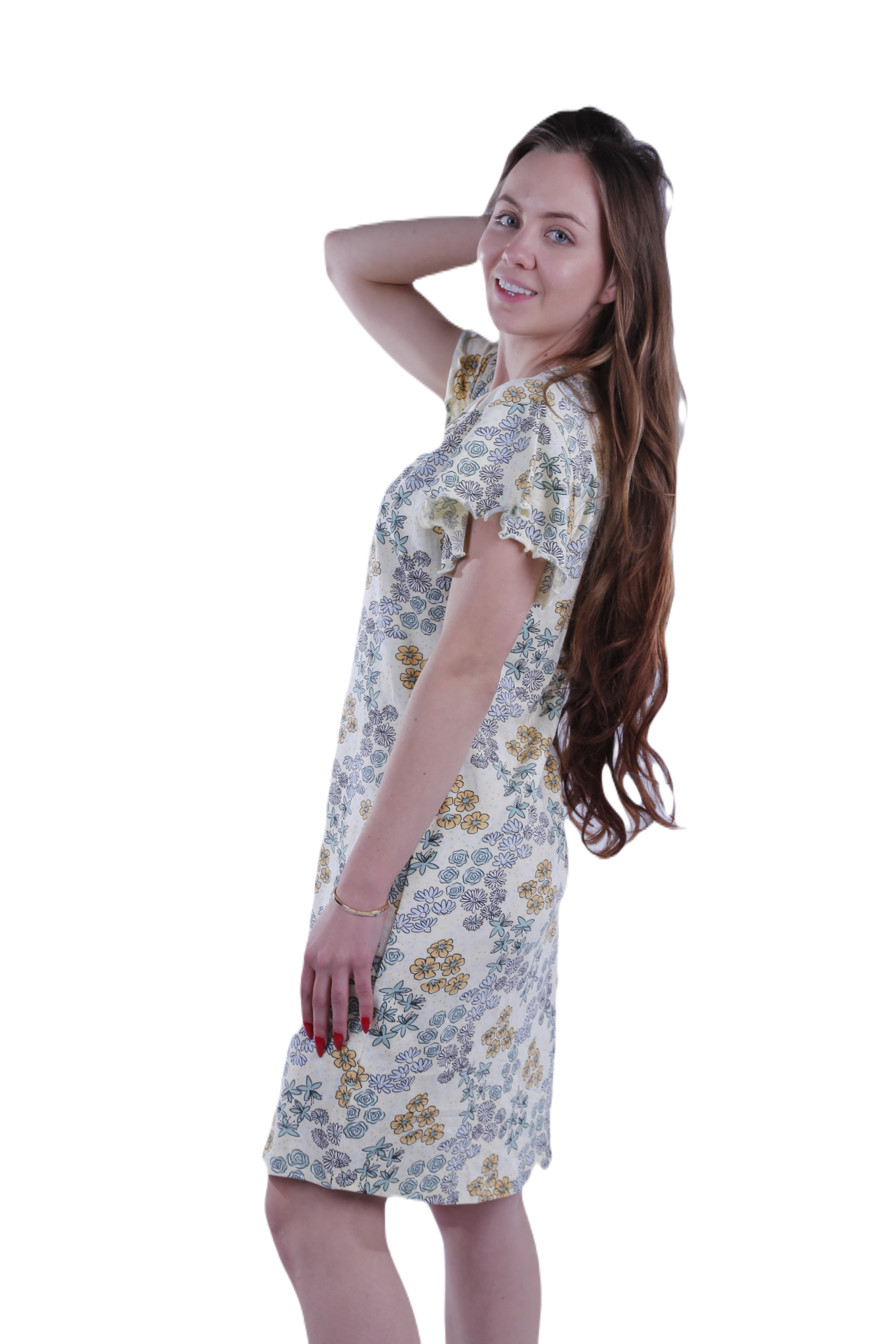 Women Short Sleeve Frill Dress - Transparent Yellow Garden Flower